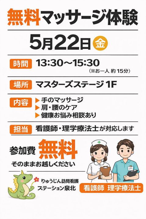 5月22日◎マスターズステージ泉が丘で「りゅうじんマッサージ®体験会」を開催します【泉北】 NEW 2026-04-29 マスターズステージ泉が丘で、「りゅうじんマッサージ®体験会」を開催します。 日時: 2026年5月22日(金)13:30~15:30 場所: マスターズステージ泉が丘 内容: ✅手のマッサージ ✅肩、腰のケア ✅健康相談 前の記事5月18・20・21・22日◎「りゅうじんマッサージ®体験会」を開催します【阿倍野】